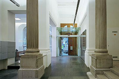 Die neuen Einbauten erfolgten großteils aus Glas: ein transparenter Glaswürfel als Eingangswindfang mit automatisch öffnenden Türen sowie große Glaswände mit Schiebetüren zur neuen Portierstelle.
